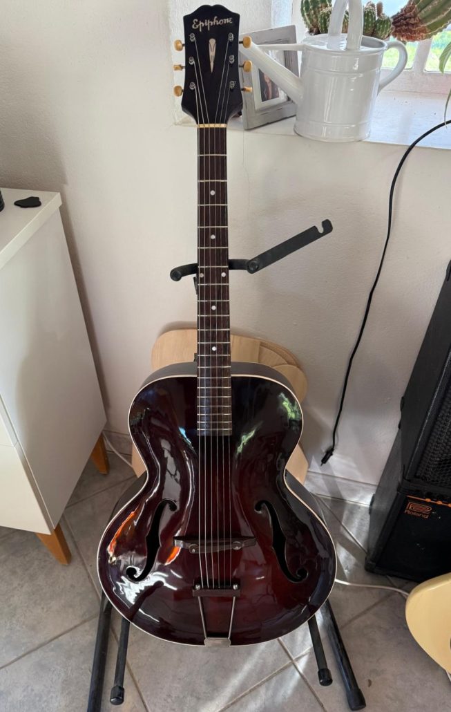 Zunächst wurden alle Metallteile entfernt, auch die Bünde. Die Gitarre wurde entlackt (das macht man mit einer Ziehklinge) und die Decke restauriert (siehe Bild). Nachdem der Hals geradegezogen wurde, konnte das Griffbrett abgezogen werden, hier wurde der 12er Radius beibehalten. Ebenfalls wurde die Kopfplatte gerichtet, welche ein Loch und Abplatzungen auf der Rückseite aufwies. Das fehlende Binding konnte farbtreu ersetzt und verschliffen werden. Die schöne originale Brücke wurde aufbereitet und mit funktionstüchtigen Rändelschrauben ausstaffiert. Nach der Lackierung mit Nitrolack, Feinschliff und Hochglanz-Politur und Installation eines Dearmond Rhythm-Chief 1000 ist das Instrument wieder perfekt bespielbar mit einer Top-Saitenlage. Der Klang ist akustisch und elektronisch abgenommen hervorragend. Und ganz nebenbei ist ein Vintage-Schmuckstück, welches Platz in jedem Wohnzimmer haben dürfte!