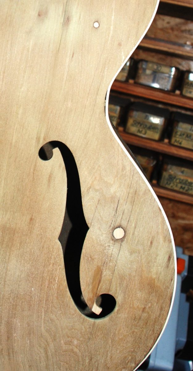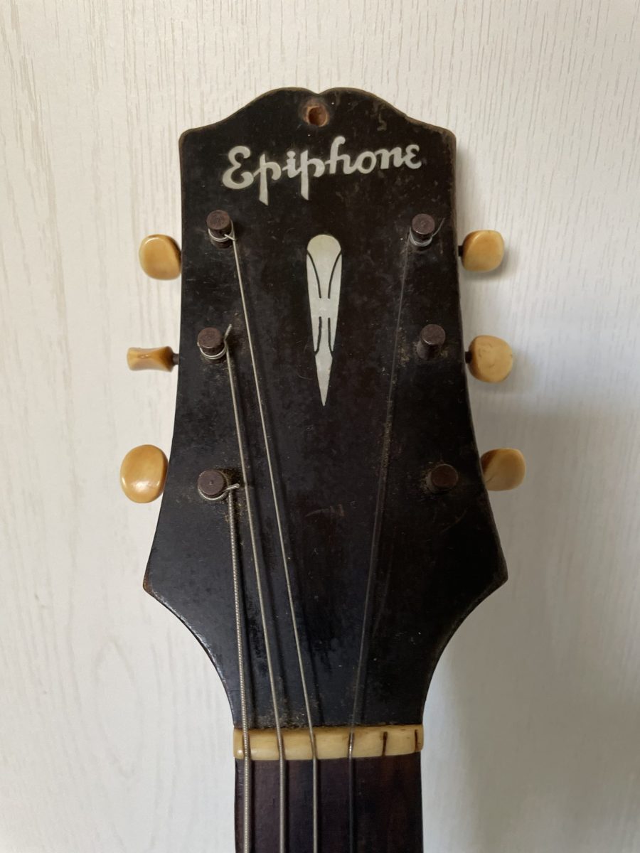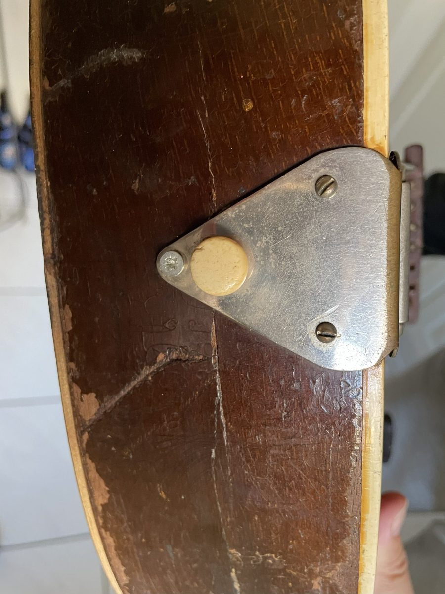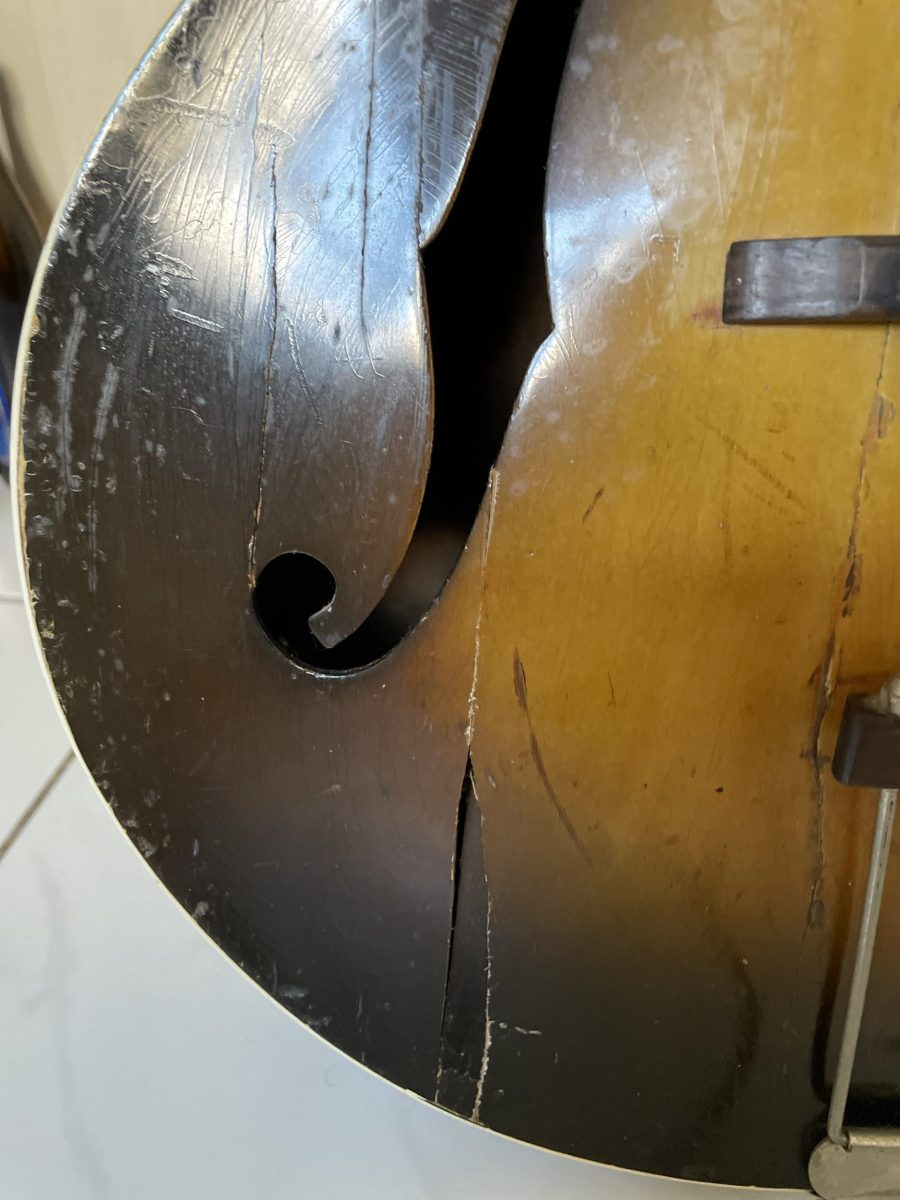 Diese kleine Epiphone Zenith kam wirklich desolat in meine Werkstatt! Die Decke war gerissen, sogar gesplittert. Löcher waren in die Decke gebohrt und ein Stück am F-Loch war abgebrochen. Die Bünde hingen lose im Griffbrett, welches jemand mit einer Feile traktiert hatte und tiefe Riefen aufwies. Der Hals war krumm und die Brücke unbrauchbar. Das Binding war zum Teil abgelöst und am Boden fehlte es komplett. Hier einige Bilder vor der Restaurierung: