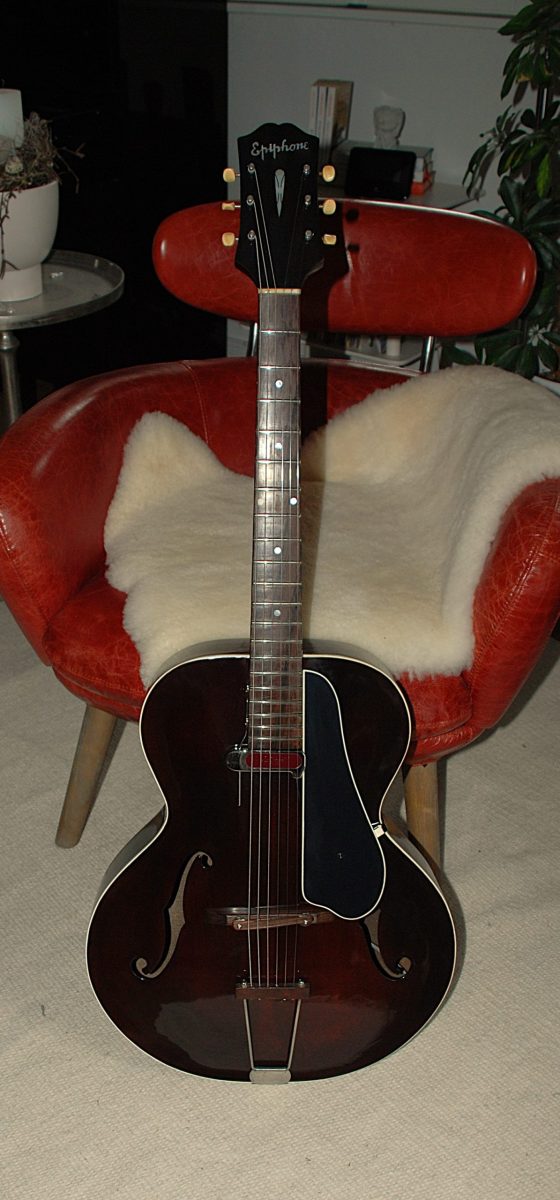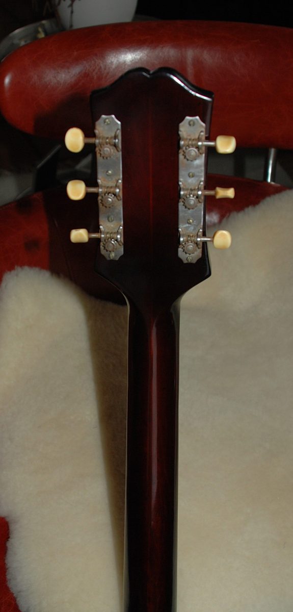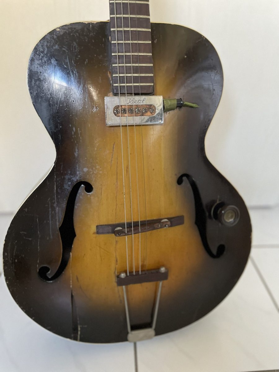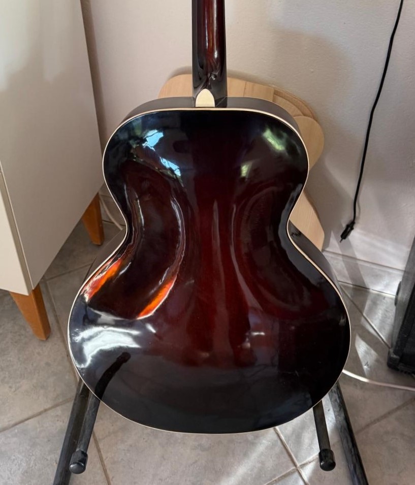 Zunächst wurden alle Metallteile entfernt, auch die Bünde. Die Gitarre wurde entlackt (das macht man mit einer Ziehklinge) und die Decke restauriert (siehe Bild). Nachdem der Hals geradegezogen wurde, konnte das Griffbrett abgezogen werden, hier wurde der 12er Radius beibehalten. Ebenfalls wurde die Kopfplatte gerichtet, welche ein Loch und Abplatzungen auf der Rückseite aufwies. Das fehlende Binding konnte farbtreu ersetzt und verschliffen werden. Die schöne originale Brücke wurde aufbereitet und mit funktionstüchtigen Rändelschrauben ausstaffiert. Nach der Lackierung mit Nitrolack, Feinschliff und Hochglanz-Politur und Installation eines Dearmond Rhythm-Chief 1000 ist das Instrument wieder perfekt bespielbar mit einer Top-Saitenlage. Der Klang ist akustisch und elektronisch abgenommen hervorragend. Und ganz nebenbei ist ein Vintage-Schmuckstück, welches Platz in jedem Wohnzimmer haben dürfte!