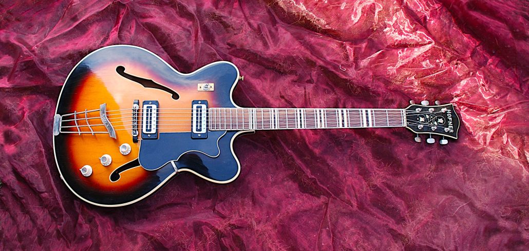 Die Gitarre mit einem modernen Doppel-Cutaway verfügt bereits über einen funktionsfähigen Halsstab. Dennoch war die Halszunge nach oben gewölbt. Demzufolge mussten die Bünde entfernt werden und der Hals gerade geschliffen werden. Nach der Neubundierung liegt ein perfekt gerade Hals vor. Die Lackierung konnte original erhalten werden. Es wurde teilweise etwas farbtreu retuschiert und ein Overspray mit Feinschliff und Politur durchgeführt. Zusätzlich musste die ganze Elektronik überarbeitet werden. Nun hat man ein tolles, sehr leichtes und sehr gut bespielbares Instrument vorliegen. Die originalen Höfner Tonabnehmer haben ordentlich Power.