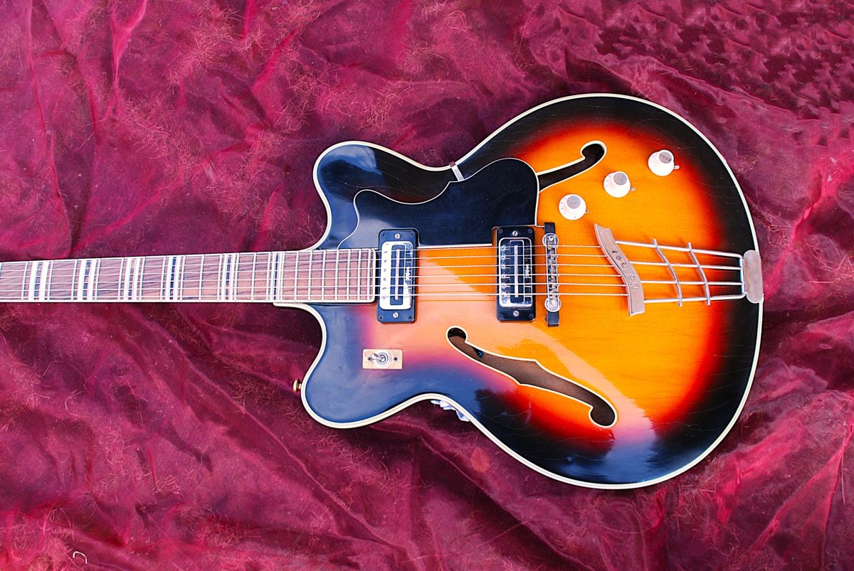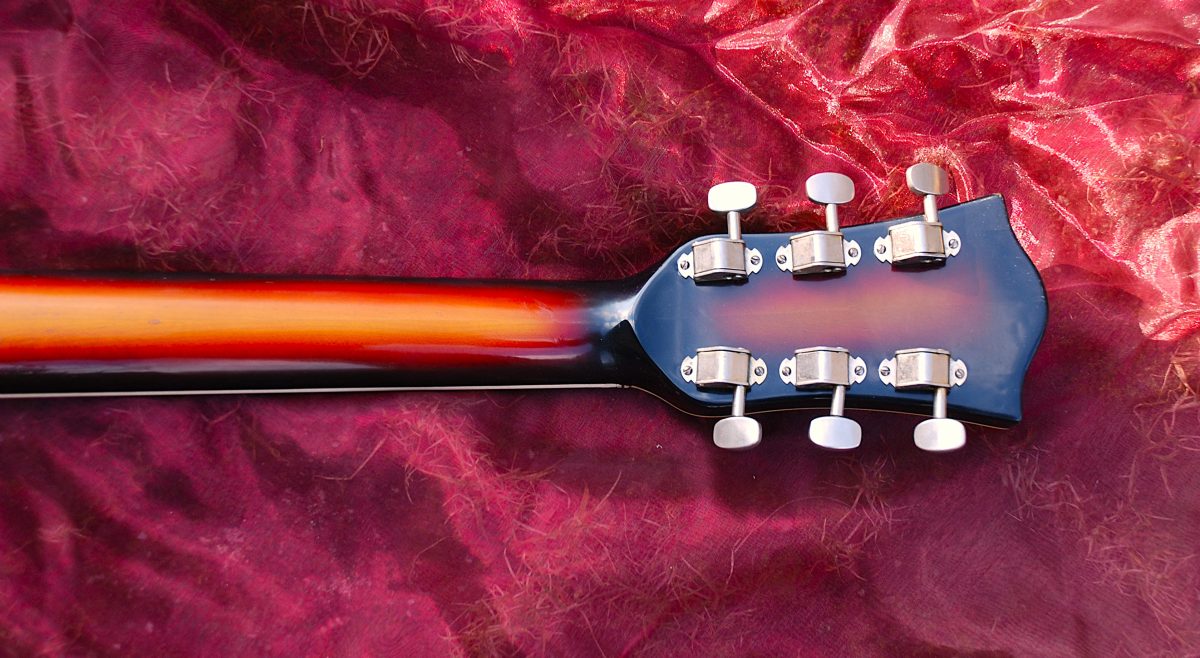 Die Gitarre mit einem modernen Doppel-Cutaway verfügt bereits über einen funktionsfähigen Halsstab. Dennoch war die Halszunge nach oben gewölbt. Demzufolge mussten die Bünde entfernt werden und der Hals gerade geschliffen werden. Nach der Neubundierung liegt ein perfekt gerade Hals vor. Die Lackierung konnte original erhalten werden. Es wurde teilweise etwas farbtreu retuschiert und ein Overspray mit Feinschliff und Politur durchgeführt. Zusätzlich musste die ganze Elektronik überarbeitet werden. Nun hat man ein tolles, sehr leichtes und sehr gut bespielbares Instrument vorliegen. Die originalen Höfner Tonabnehmer haben ordentlich Power.